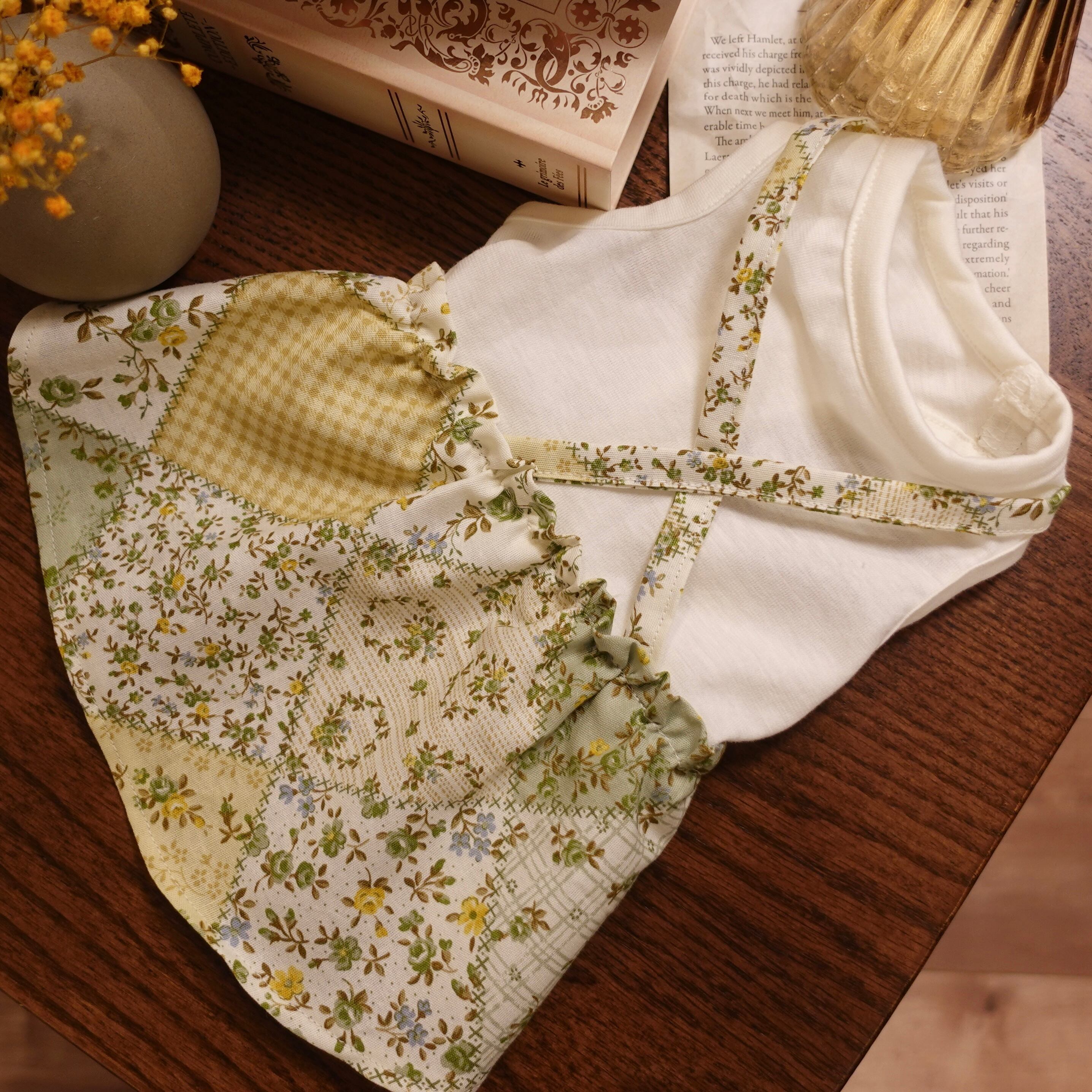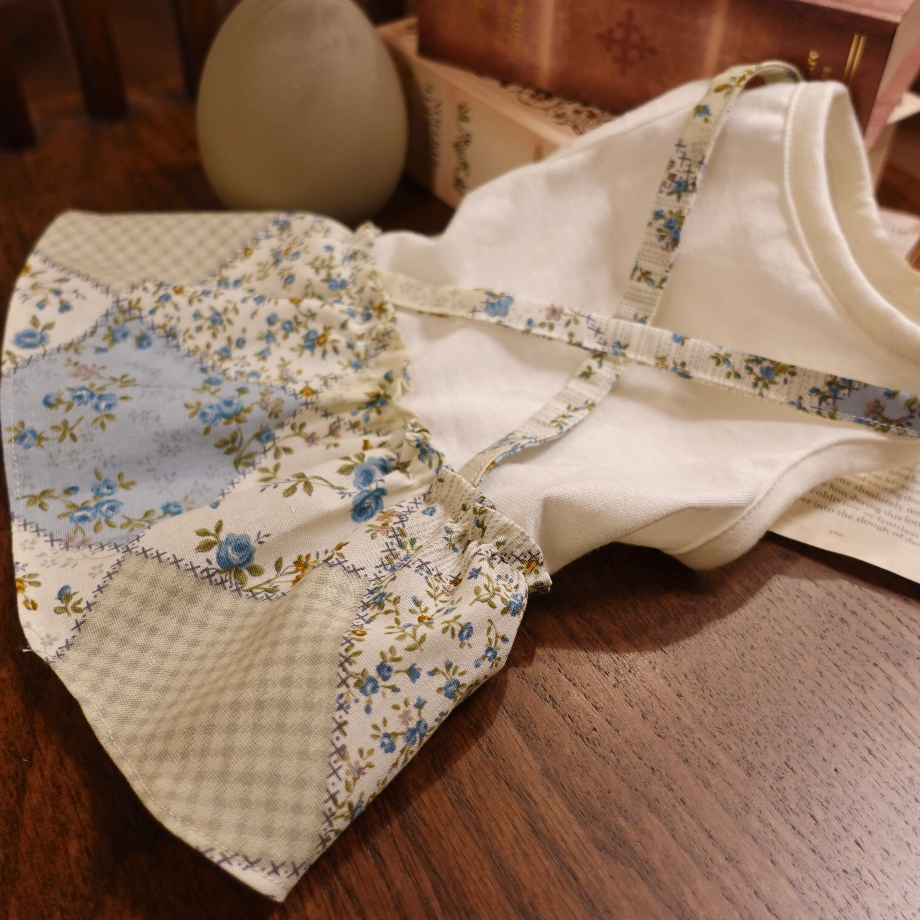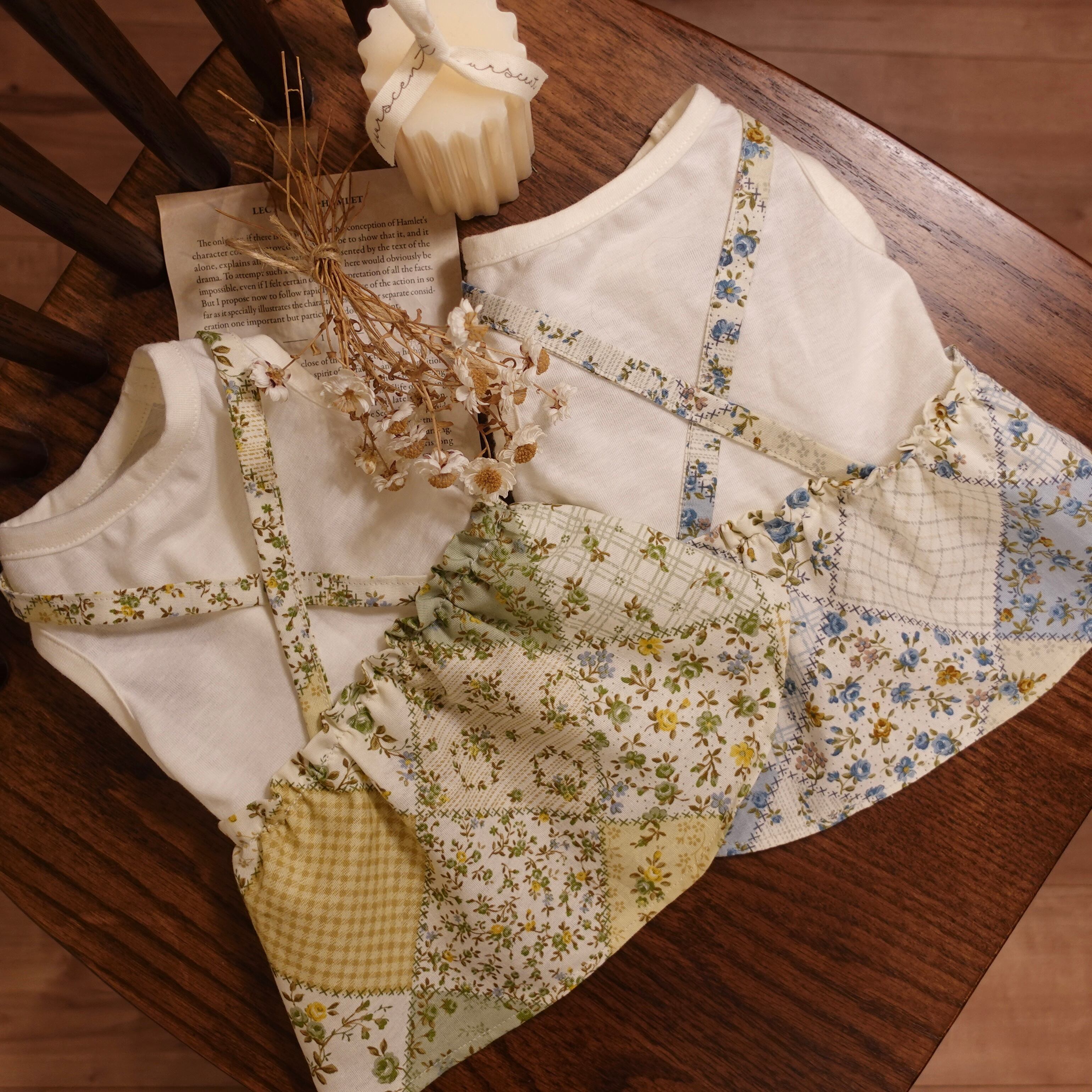 パッチワーク柄の吊りスカートをデザインしたワンピース。