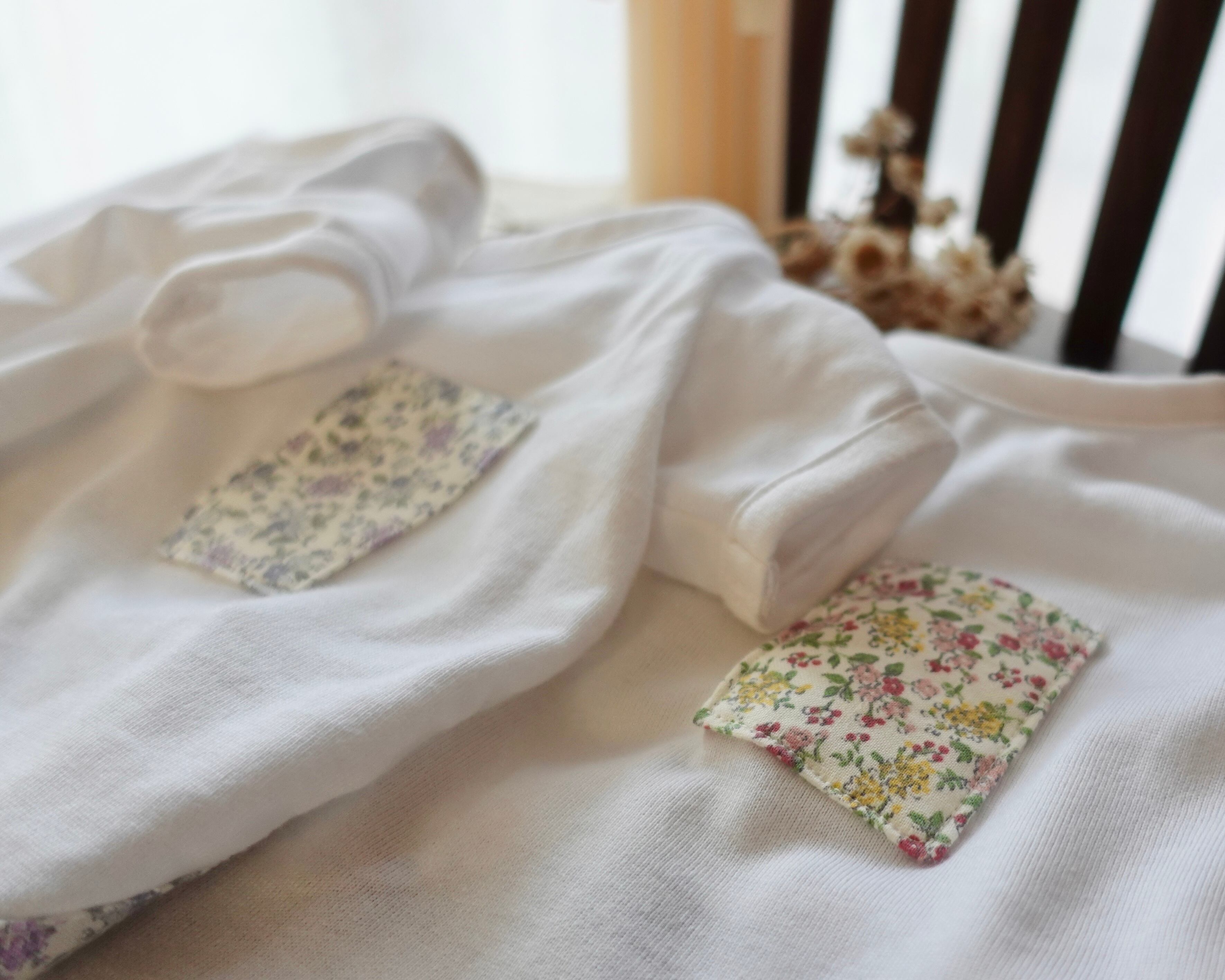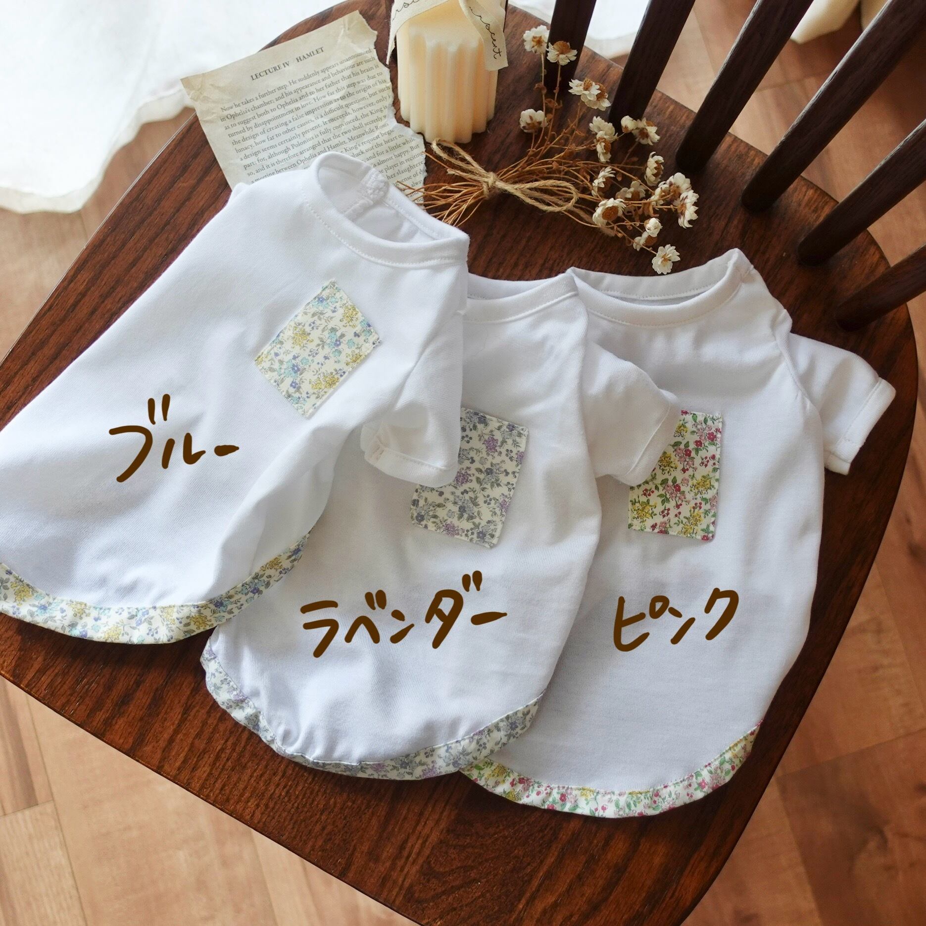 ポケットと裾に小花柄をあしらったコットン100%のTシャツです。