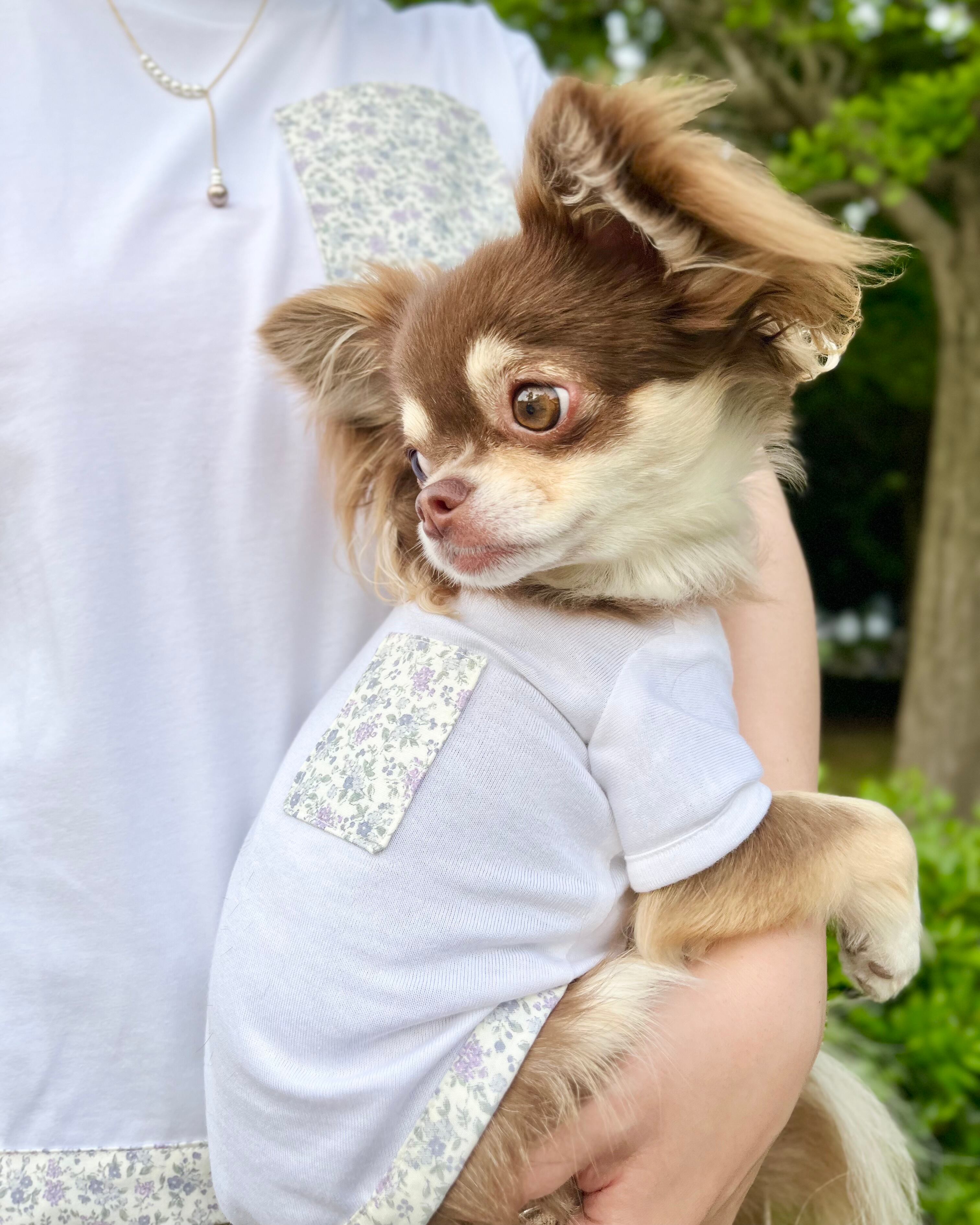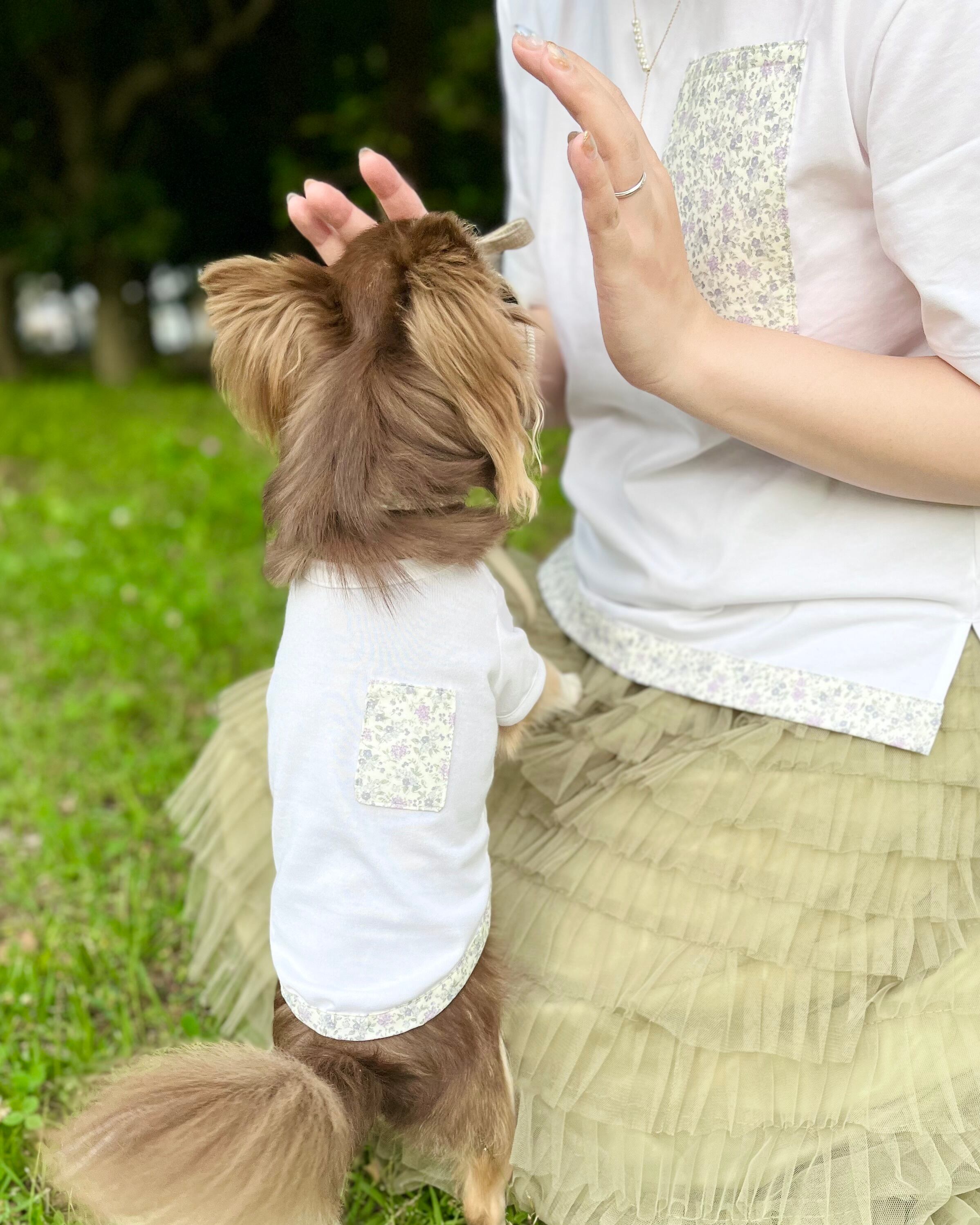 飼い主さんとお揃いコーデができる人用Tシャツも販売しております。別ページよりぜひお求めください。